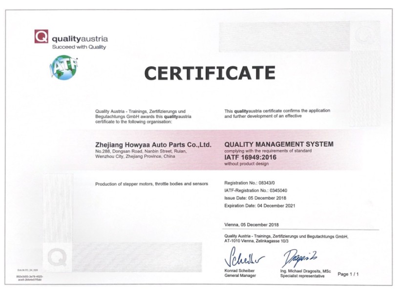 HOWYAA company passed the ISO9001:2000 quality management system certification in 2006, the TS16949:2009 automobile industry quality certification in 2010,and the new edition of IATF16949:2016, in 2018, also obtained many honorary certificates like Zhejiang science and technology enterprises, National high-technology enterprises,Brandname products and so on.In order to improve competitiveness in the industry, company began to introduce TOYOTA lean production management model in 2017 and achieved remarkable results.